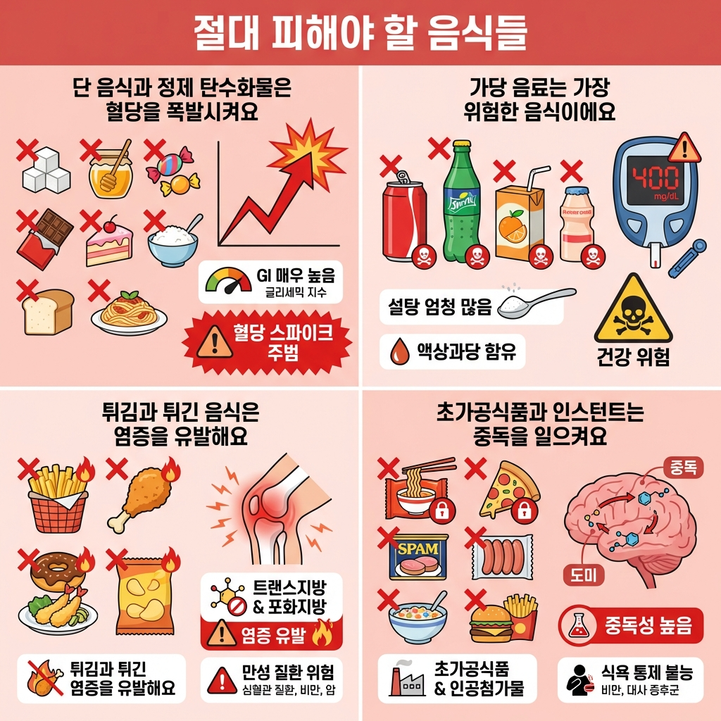 설탕, 꿀, 사탕, 초콜릿, 케이크 같은 단 음식은 피해야 합니다. 흰쌀밥, 흰빵, 파스타 같은 정제 탄수화물도 혈당을 급격히 올려요.