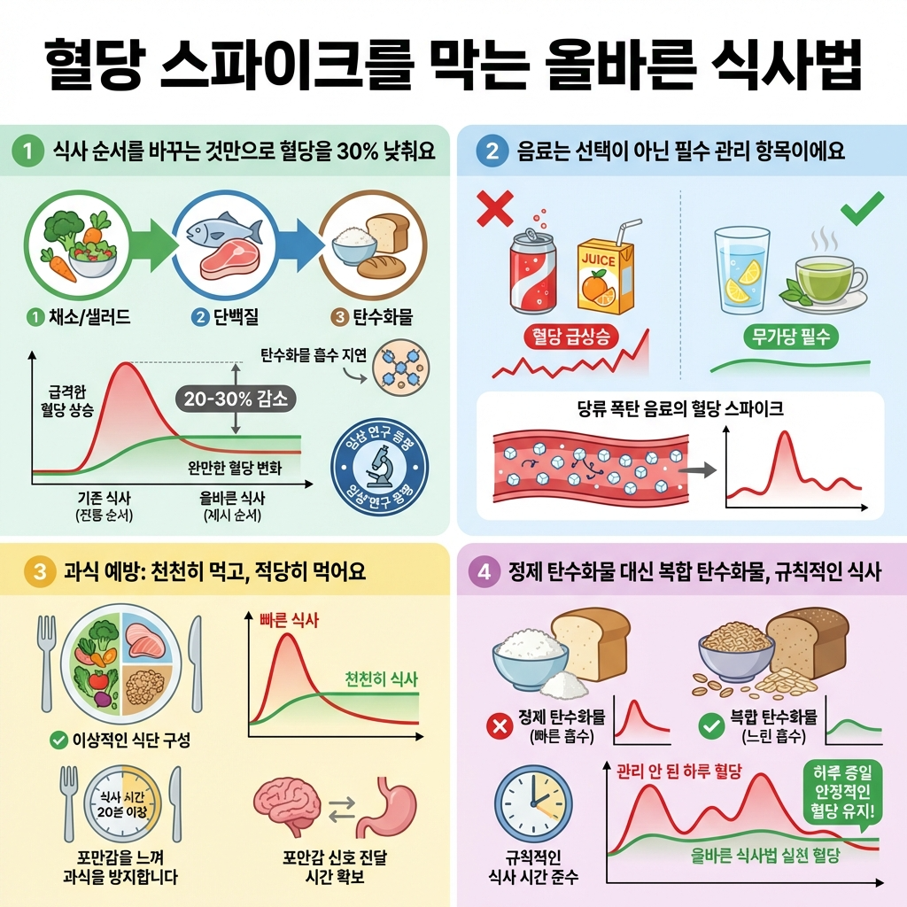 채소 → 단백질 → 탄수화물 순서로 먹으면 혈당 상승이 20~30% 낮아집니다. 이는 여러 임상 연구에서 증명된 방법이에요.