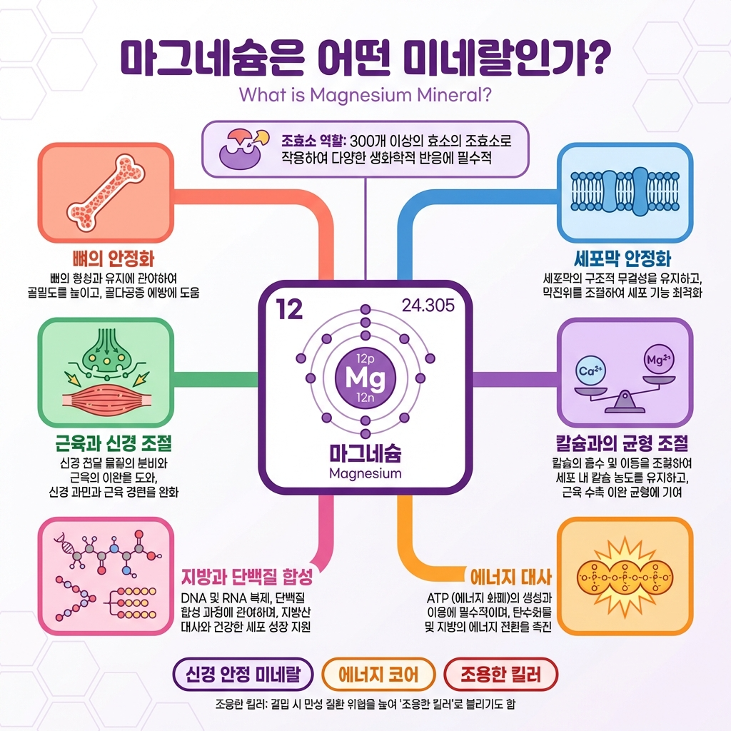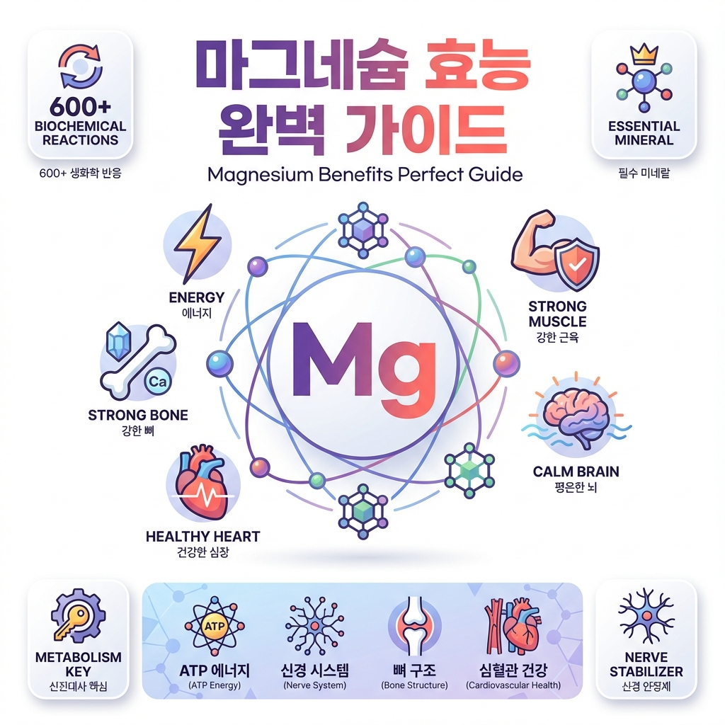 마그네슘은 우리 몸에 있는 필수 미네랄 중 하나로, 특히 신진대사를 주관하는 300개 이상의 효소가 제 기능을 발휘하도록 돕는 조효소 역할을 합니다. 🔬