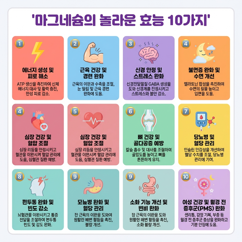 마지막 조언: 마그네슘의 효능은 단순히 '피로 회복'에 그치지 않습니다. 신경계, 심혈관계, 뼈 건강, 정신 건강까지 우리 몸의 거의 모든 시스템에 관여하는 필수 미네랄입니다. 특히 스트레스가 많은 현대인에게는 거의 필수적인 영양소라고 봐도 과언이 아닙니다. 마그네슘이 부족하지 않은지 확인하고, 꾸준히 섭취해보세요. 당신의 몸이 감사할 것입니다! 🌟