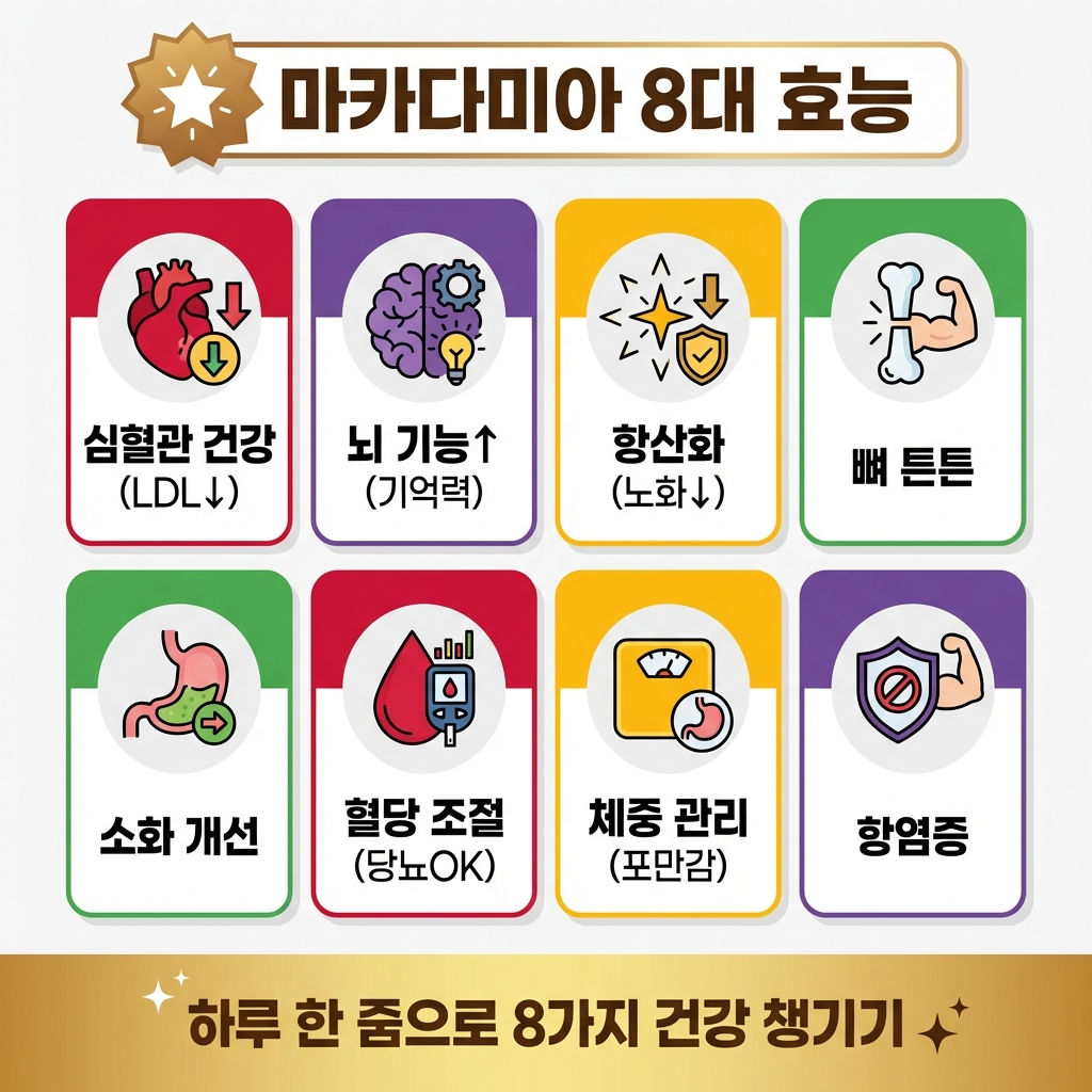 마카다미아에 들어 있는 팔미톨레산이라는 불포화지방산이 나쁜 콜레스테롤(LDL)을 낮춰줍니다. 💰 혈관이 깨끗해지면 혈압이 안정되고, 심장병이나 뇌졸중 위험도 크게 줄어들어요.