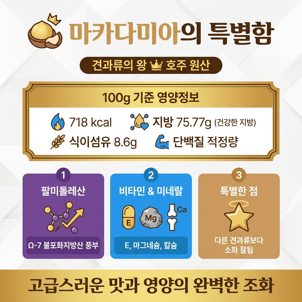 마카다미아는 호주가 원산지인 견과류인데, 단순한 간식이 아니라 영양의 보고입니다. 💡 다른 견과류와는 달리 불포화지방산, 특히 팔미톨레산이라는 특별한 성분이 풍부하다는 게 가장 큰 특징입니다.