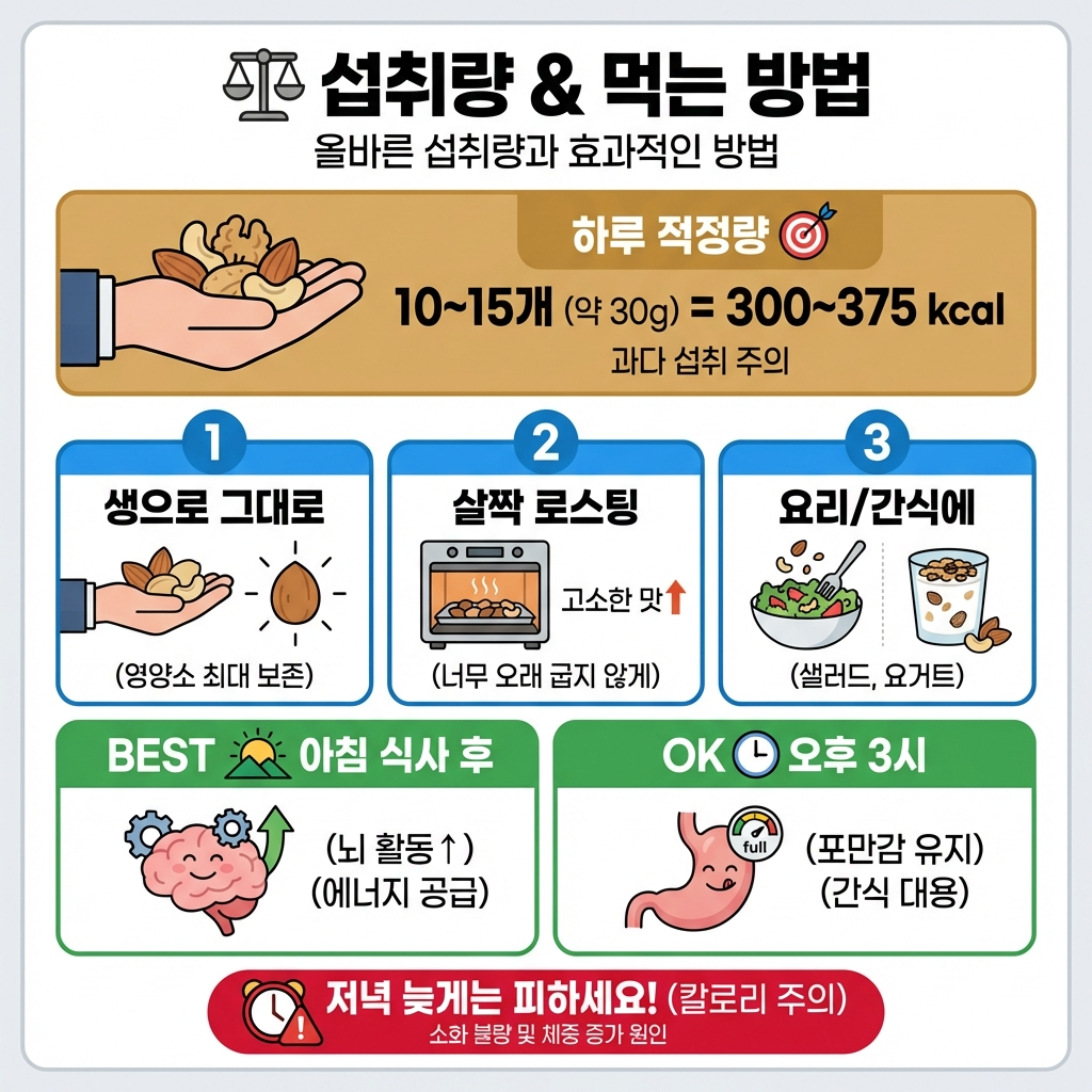 💬 하루 10~15개, 약 30g이 적정량입니다. 이 정도면 영양은 충분히 챙기면서 칼로리는 적절하게 유지할 수 있어요. 한 줌 정도면 딱 맞는 양입니다!