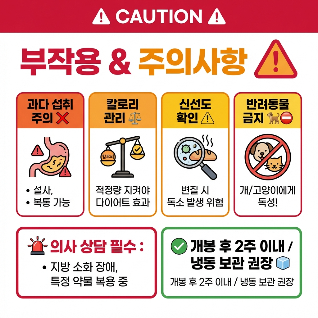 지방과 섬유질이 풍부해서 과다 섭취하면 장이 너무 활발해져서 설사가 나올 수 있습니다. 🚨 특히 예민한 소화기를 가진 분들이라면 주의해야 합니다.